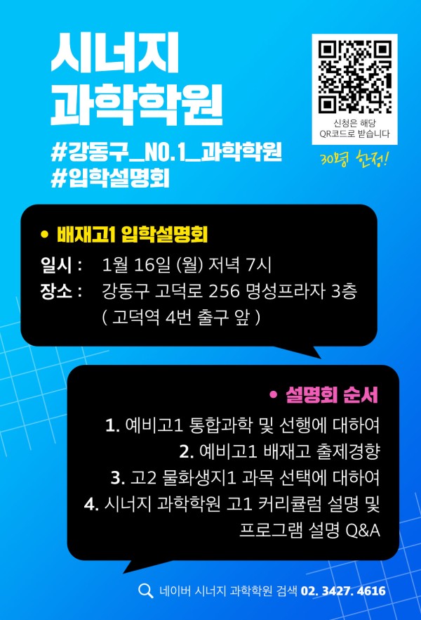 배재고 예비고1 대상 설명회 개최 페이지 정보 작성자 와이즈과학학원 댓글 0건 조회 303회 작성일 22-12-07 19:51 목록 본문 참석 신청 폼 주소 : https://forms.gle/DQtNv5kQ9WaqLsAWA 이전글수강료 인상 안내문 23.02.15 다음글학원 사이트 내 수강신청 가이드라인 22.11.20 댓글 0 댓글목록 등록된 댓글이 없습니다.